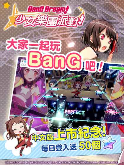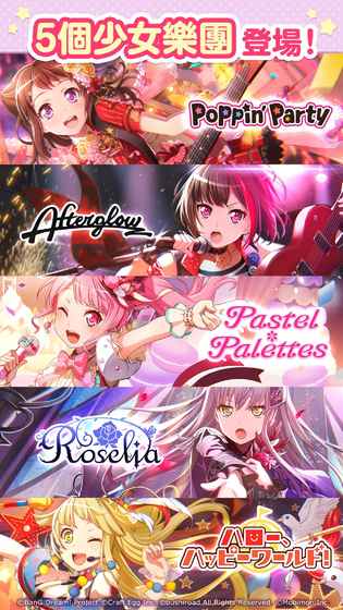 日本少女系音樂遊戲《BanGDream!少女樂團派對》大家一起玩BanG吧!.日本高校少女樂團-「Poppin’Party」.王道女孩搖滾樂團-「Afterglow」.新生代偶像美少女樂團-「Pastel*Palettes」.技巧本格派女子樂團-「Roselia」.歡樂X幸運X微笑少女樂團-「HELLO、HAPPYWORLD!」樂團演出歌曲-日本熱門音樂榜「LIVE原創曲」,還收錄多首「知名動畫翻唱歌曲」!.紅蓮の弓矢(作詞?作曲:Revo).Don’tSay“lazy”(作詞:大森祥子;作曲:前澤寬之).光るなら(作詞?作曲::Goosehouse).魂のルフラン(作詞:及川眠子?作曲:大森俊之).天体観測(作詞?作曲:藤原基央)※僅介紹一部份,未來陸續在遊戲內登場和朋友組BanG瘋音樂.最多5人協力LIVE演出!.多人同時線上LIVE演出,大家一起組BanG吧!.無體力限制-瘋狂挑戰節奏極限,每天都要BanG一下!5個少女樂團專屬故事.開始吧!我們的BanG!.從成立樂團到站上LIVE舞台的青春軌跡,一起閃閃發光吧~.解放樂團故事拿卡片,25張樂團少女卡片等你收藏.細膩生動LIVE2D技術.「樂團少女的日常」全收錄