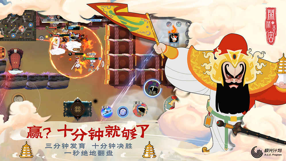 闹闹天宫是一款横版MOBA手游。游戏没有防御塔,没有小兵,没有水晶,玩家要做的就是抢夺更多的仙桃,并且抵御对手的抢夺,将仙桃保留到最后一刻,独特的玩法模式,让玩家尽享新鲜的战斗乐趣。游戏角色全部出自于以西游记为主的神话故事,角色和地图都带着浓厚的经典国风美术风格,但又融合了当前时代的审美形象,带给玩家充分的视觉体验。闹闹天宫操作简单易上手,一把花不了多少时间,玩家可以随时随地打开游戏耍上一局,快来下载吧!