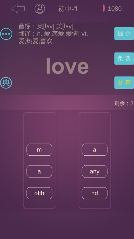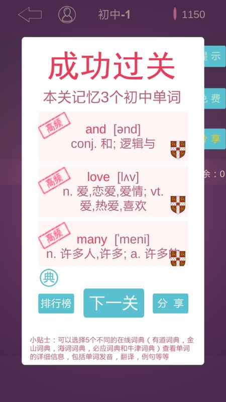 英语消消乐是一款帮助用户记忆英语单词的应用。用户一边过关得分,一边巩固已掌握的单词和学习新的单词,可以显著提高记忆的词汇量。英语消消乐一共包含14000+英语单词,可以选择不同的难度:初中,高中,四级,六级,考研,雅思,托福,GRE。其中初中单词1410个,高中单词1974个,四级单词1497个,六级单词1288个,考研单词2409个,雅思单词2340个,托福单词2103个,GRE单词5994个。单词被分成2部分或者3部分,选择不同部分组合成一个完整单词就能获得得分。单词分为高频和非高频单词,同一模式下前面的关卡是高频单词关卡,后面的关卡是非高频单词关卡。新增擂台功能、排行榜、勋章和星级模块,使背单词更加有趣。可以通过5个在线词典(有道词典,金山词典,海词词典,必应词典和牛津词典)来查看完整单词的详细信息,包括发音、例句、英英释义、专业释义、同近义词等。不少用户反馈这种通过过关得分的方式来记忆单词十分有趣而且能有效提高背单词的效果。群号是:524340984,欢迎加入讨论。1,增加口语模块;2,调整UI