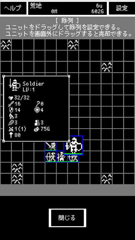 パーティは最大で60ユニット登場味方ユニットは30種類壮絶なバトルが熱中させるはず。[Credits]キャラクタ素材DENZI様http://www3.wind.ne.jp/DENZI/diary/音楽素材スキップモア様http://www.skipmore.com/app/[仕様変更]2周目以降、敵が居る場合に[撤退]および[セーブして終了]ができない。2周目以降、全滅しても残ったGoldで[コンティニュー]することができる。[追加機能]ユニット購入画面にて[シャッフル]ボタンを追加。お求めのユニットが出るまでシャッフル可能。[追加Playerユニット]HighWarrior最高位の攻撃力Warriorの超強化版。2周目以降登場HermitRange5の光魔法使用者。2周目以降登場[追加Enemyユニット]GoblinArcher,MartyrSleepFlower,HawkGuideArcher,DuelSoldierDwarf,GiantKnightPredator,EvilPriest[追加Bossユニット]LastLucifer[バランス修正]2周目以降の敵ユニットを強くしたPlayerユニットのレベル上がりやすくした(前バージョンのユニットは売ったほうがよい)その他調整[不具合修正]HighAngelがPlayerの中にテレポートする不具合修正その他極小バグ修正