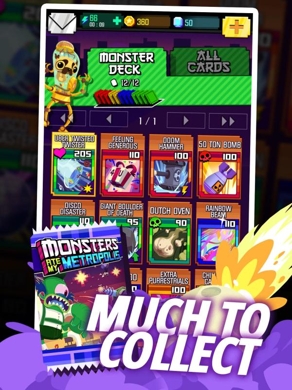 FromthepeoplewhobroughtyouRobotUnicornAttack2andGiantBoulderofDeath¡ªthemonstersareback,andthey'redealingoutdestruction!Pickyourfavoritekaiju,assembleadeckofspecialcardsandtimeyourattackstodestroythecity.Battlerivalplayersfromaroundtheworldtodecidewho'skingofthemonsters.Unlockablemonsters,rareprizes,leaderboards,tournamentsandmoremakethisthecardgametotopplethemall!CHOOSEYOURMONSTERUnlockandplayasgiant,crazymonsters.EachhavetheirownspecializedMegaZoneattacks,elementalbuffs,criticalhitchancestats,andbonuses.Earnenoughtokenswinningmatchesandyou¡¯llbeabletounlockthemall.Feedthemyourunused/unwantedcardstolevelthemupfastandmakethemevenmorepowerful.FAST,FURIOUSGAMEPLAYEachsideisdealtthreecards(fromtheirdeckof12)andtakesturnsattackinguntiljustoneisleftstanding.Damageisbasedoncardpower,element(blue,red,green,yellow),andyourtimingontheboostminigame.Eachattackbuildsyourmonster¡¯sMegaZonemeter;whenit¡¯sfullyoucanforegothecardsandunleashamega-poweredattackthat¡¯llwipethesmilerightoffthatcity¡¯sface.SCALEWEEKLYGLOBALTOURNAMENTLEADERBOARDSPummelopposingcitiestoincreaseyourmetropolis¡¯populationandpositionintheweeklytournamentleaderboards.Evenifyouloseorareattacked,you¡¯llgainvaluableexperienceandacoupleofprecioustokenstoo.Andifyouwin,you¡¯llgetevenMOREexperiencepointsandcurrency.Fiveleagues(Plushy,Mascot,Monster,EliteandBoss)await!COLLECTALLTHETHINGSFourferociousmonsters,over100attackcards(withmorecominginfutureupdates).BuildyourCity(defense)andMonster(offense)decksanywayyoulike!TAPTOTOPPPLEWhenyourmonsterattacksyou¡¯llbepromptedtotapthescreenatjusttherighttimetoboostyourcard¡¯sstatsevenhigherforamoredevastatinghit!(Andyesthereisanoptionfortheslow-reflexedtoturnthatoff.)CONNECTFORBONUSESConnectyourFacebookaccounttogetaFREEcard,energy,andtokensfromyourbuddies.Thisalsoactivatescloudsavetorestoreyourprofileonanotherdevice!FollowUs:Facebook-http://www.facebook.com/adultswimgamesTwitter-https://www.twitter.com/adultswimgamesOurWebsite-http://www.games.adultswim.com1.2.1What'sNew-NEW!DailyCardReward!Useyourtokenstobuyabrandnewcardeverydayoftheweek.Allrarities!-NEW!UseAppleReplayKittorecordyourbattlesandsharewiththeworld!-NEW!Spookoutyourfriendsandcollectour3specialHalloweenCardsforHalloweenWeekendonly!-Multiplebugfixesandperformanceimprovements-Don'tforgettologintoFacebookandclaimyourFREECARD!