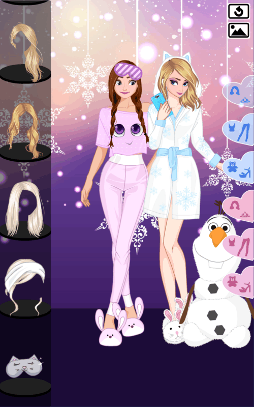 Coolfamoussisters,youlovesomuch.Botharethemagicdreamofanygirlintheworld.Theyperfect,niceandfashion.Andbothlovesleepoverparties.Canyouimaginethatpajamascanbealsocoolpartofadressup,sotheywillnotgetfrozenduringacoldwinternight.Funnysoftslipperswithgentlebunnyearsmakethepartysweetandunforgettable.Also,thehairstyleisimportantduringslipoverpartyevenifyougoingtosleepwithanicehairstyle.Andespeciallyforthesesistersespeciallytheicytopisanaturaladditiontothisparty.Makebothsisterstobethebestduringthisslipoverevent.