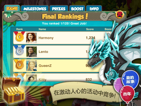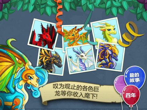 在魔法岛屿上孵化、喂养及培育500种以上的龙,庆祝《龙族物语》4周年纪念日的到来!将一大批龙宝宝精心养育成史诗形态的成年龙并繁殖它们的后代,探索新的龙种!成为最棒的守龙人-你可以成为第一个发现超级罕见钻石龙的人!推出全新的排行榜活动!与好友和社区成员一较高下,赢取稀有的专属奖励。你有办法夺得第一吗?《龙族物语》特性:-收集20多种威猛、神秘又充满乐趣的龙!每只龙都有着时而生动活泼,时而古怪的个性!-繁殖不同类型的龙来孵化新的混血龙蛋!你能从各个颜色组合中发现稀有的龙吗?-斗龙赢大奖并参加锦标赛!-在农场种植魔法食物来饲养你的龙。然后看着它们历经4个特别的进化时期成长和进化!-参加龙族故事活动和每月的全球活动,赢得新的龙蛋、栖息地和装饰,以及额外的社区奖励!-使用多彩的栖息地、城堡塔和花朵等物品装点你的小岛!-惊艳的视觉效果、动画和声音让你的幻想龙城栩栩如生。-邀请Facebook或Storm8好友与你互动。互赠金币,照料彼此的龙!-每周引进各式新龙,举办新的活动!Storm8工作室是人气最高的Android移动终端社交游戏开发商。使用此应用程序时,请遵守Storm8工作室的服务条款。数据的收集与使用受Storm8工作室的《隐私保护政策》约束。以上条款与政策可参考以下网站:www.Storm8-studios.com/terms和www.Storm8-studios.com/privacy请注意:《龙族物语?》是一款免费游戏,您还可用真实货币购买游戏内物品。要取消这项功能,通过你的设备访问GooglePlay商店,点击手机“设置”菜单,并依此选择“通用”->“使用密码限制购买”。然后按照操作指示完成设置。此外,《龙族物语?》或与Facebook等社交媒体服务相连,Storm8会通过这些服务获取您的信息。关注Storm8www.storm8-studios.comfacebook.com/storm8twitter.com/storm8《龙族物语》4岁了!参加全新排行榜活动,与我们一同庆祝4周年纪念日!和《龙族物语》社区中的玩家进行比赛,赢取惊人的全新专属奖励!作为我们4周年纪念日中的特殊奖励,你可以获得一只全新的金龙!我们的庆生活动将持续到四月,并且会推出额外的龙族故事专属活动:生日大狂欢!