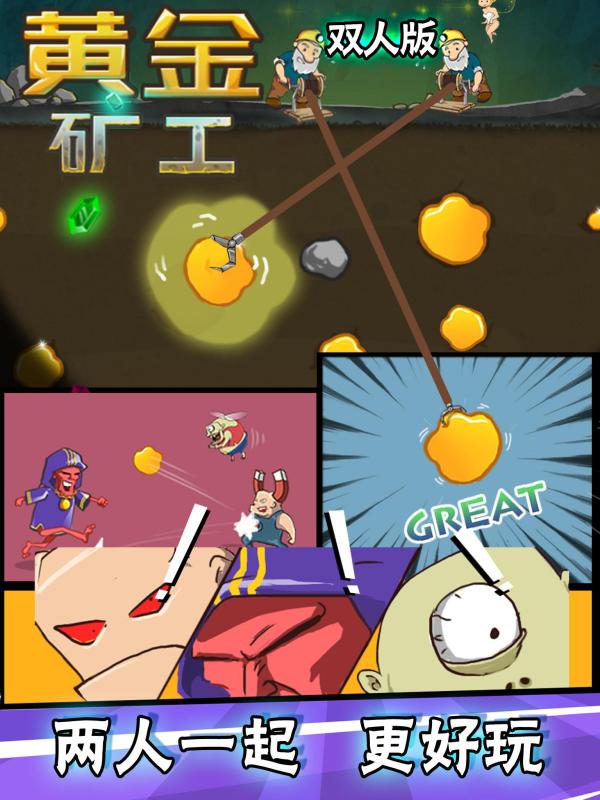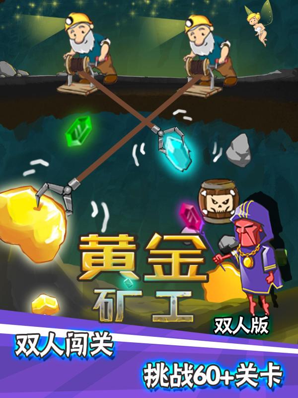 俩人一起玩,全民疯狂挖黄金!最休闲的单机Android游戏《黄金矿工-双人版》强力登陆PlayStore!现支持双人游戏模式!完全免费,还不快来下载!黄金矿工-双人游戏(GoldMiner)是经典流行的在线休闲小游戏。《黄金矿工-双人版》趣味无穷,遍布黄金宝藏的矿区等你去挖掘!在游戏中,可以通过“挖矿”获得金钱并不断升级。*游戏操作简单,在钩子摇摆的过程中,瞄准金子,点击屏幕时即会释出钩去抓取金子。*每一个新关卡的地图都会不同,所以每次打开都是一次新的挑战!游戏特性:-双人同屏作战,共同闯关,一起冒险!-引人入胜的高清画质,重新演绎经典休闲游戏作品-60个完全独特关卡,经典黄金矿工玩法,停不下来!-10种全新游戏道具,各种酷炫挖金-超级华丽的游戏特效与精美的游戏界面-好听带感的游戏音效-多种游戏成就,一次全部满足你!联系我们:-访问我们的网站http://www.mongko.com-向我们写反馈邮件hello@mongko.com