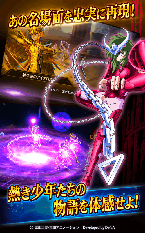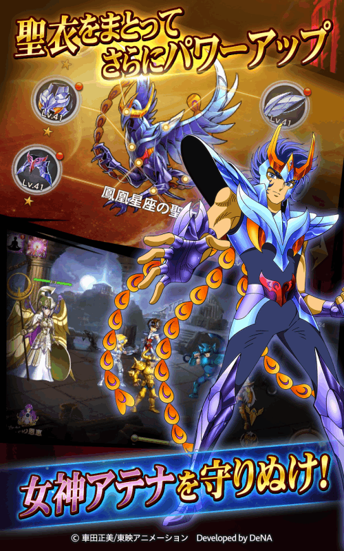 ◆東映アニメーション、DeNAが贈る、聖闘士星矢30周年記念アプリがついに登場!◆◆情熱!感動!誰もが熱中した「聖闘士星矢」のストーリーがアクションRPGに!◆◆特徴ある技の数々が、TVアニメさながらのド派手なエフェクトで発動!◆◆聖衣、小宇宙、技など聖闘士星矢ならではの各種要素でキャラクターを自由に強化!◆----------------------------------------------------------ゲーム紹介?キャラクター達のド派手なスキルを自在に発動可能!ペガサス彗星拳、廬山昇龍覇、オーロラサンダーアタック等お馴染みの技も、シンプルな操作で、TVアニメさながらのド派手な3Dエフェクトで楽しめます。?聖闘士星矢ならではの要素満載!聖闘士たちを思いのままに育成しよう!キャラクターには、スキル、聖衣、小宇宙、などの育成要素があり、思いのままに強化することができます。エイトセンシズを解放して神の領域へ…。小宇宙を燃やして極限の力を爆発させよう!たくさんの聖闘士を強化すれば、キャラ連携も発動しやすく、より激しいバトルを展開できます。?様々な遊び方ができるコンテンツ満載!イベントクエスト、PvPが楽しめる競技場、ギルドBOSS戦など、ストーリーステージとは違った遊び方ができるコンテンツが満載です!【推奨端末】Android4.1.2以降※RAM1GB以上の端末を推奨しています。※一部機種に関しては推奨バージョン以上でも動作しない可能性がございます。※ベータ版としてリリースされているOSでの動作につきましては、サポートの対象外となります。?車田正美/東映アニメーション DevelopedbyDeNA