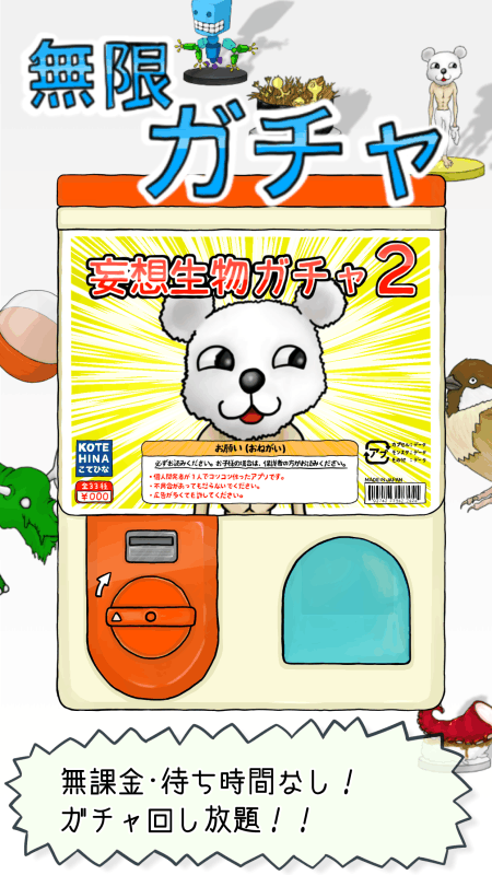 目指せコンプリート!すべてのアイテムを手に入れるまでガチャガチャを回し続けよう!!カプセルの中には子供の頃、ノートに描いた落書きのような不思議な生物が入ってるよ?無限ガチャは大人から子供まで誰でも遊べるガチャゲームアプリです。ゲットしたアイテムを棚に並べて鑑賞しよう。何度見ても理解できないような変なアイテムやついつい集めたくなるアイテムがたくさんあります。なにがでるかは運次第。是非ガチャガチャしまくってください!!旅行で渋滞に巻き込まれた時や二日酔いで動けない時、ひとりぼっちの昼休み等に暇つぶしに遊んでみてください。子供がグズッた時にも役にたつかもしれません!?新台「超絶進化ガチャ」追加しました!!?ハンドルの魔改造機能を追加しました!!?ガチャLvを見やすくしました!?画像が黒く塗りつぶされてしまっていた不具合を修正しました。