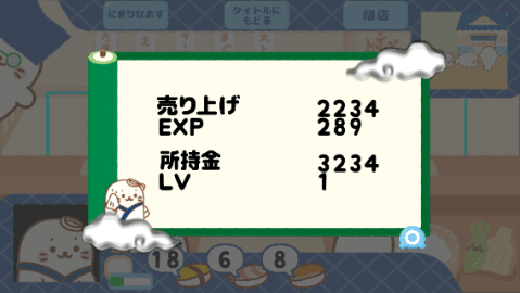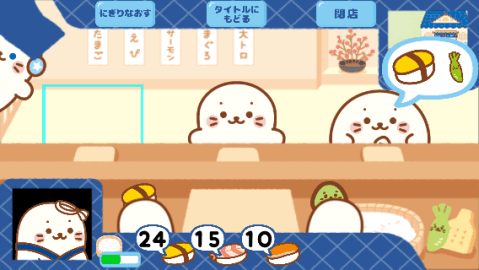 ストーリー:しろたんのおすし屋さん「しろたん寿司」をオープンさせた大将たん。大将たんのお店は少しさびれた町にあります。大将たんはその町をにぎやかな活気ある町にしたいと思いました。お店を盛り上げ有名になれば、たくさんのしろたんが町に来てくれるに違いない!今日も大将たんはがんばってお寿司を握ります!?お店に行く前にお家でのんびり休みましょう!?ご来店のお客たんにお寿司を握ってあげましょう!?良い成績を出して町を成長させましょう!?大将たんのレベルを上げ、更なる進化をとげましょう!?お客たんは全部で20種類。お客たん図鑑の完成を目指しましょう!?1.0.08:以下の不具合の修正および機能改善を行いました。?ワサビの残像が発生する問題?一部の端末でスリープからの復帰時に画面がずれる問題?その他細かな不具合?アプリのアイコン画像変更?仕入れ画面の+?ボタン長押しに対応?1.0.07:データ破損に備え、ゲームデータのバックアップと復旧機能を説明画面に追加いたしました。?1.0.05:1.0.03のセーブ不能の不具合を修正いたしました。?1.0.03:所持金が不足して進行不能となった場合、トライアルステージをプレイすることで、1000コインが追加される仕様と致しました。