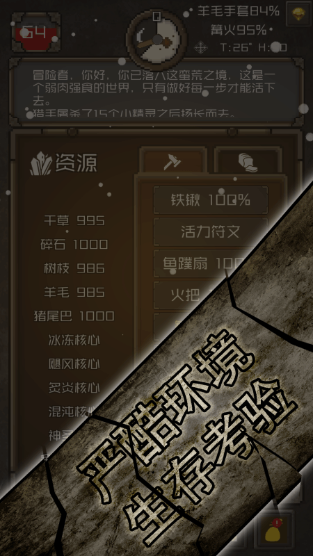 蛮荒是一款创意独特的开放式文字类冒险生存游戏。游戏简介:蛮荒讲述的是主人公在一个充满邪恶怪物的蛮荒世界里面,从无到有,不断锻炼,战胜困难,揭开谜团的故事。游戏中玩家需要从最基础的资源开始收集,不断制作和使用各种不同的道具,打造自己的家园,种植生命之树,培育小精灵,打造自己的武器装备,学习各种技能,然后在旷阔的环境中冒险,战胜各种怪物,抵御各种袭击。独特的游戏系统:?昼夜更替,玩家在白天可以外出冒险,或者在家收集资源,夜晚必须点亮火种,准备第二天外出的一切事物和道具?四季时节,动态气候,游戏中从秋天开始四季更替,还有动态的气温和湿度设定,玩家需要经历在不同的环境下的各种生存考验?百余种不同的随机事件,游戏中有不同的随机事件相互影响,每个玩家都会有不同的故事和玩法?烹饪系统,游戏中有异常多的食物可以收集,不同的食物组合可以烹饪出不同的菜肴,用于战斗和平时的补充,充满了变化和乐趣?复杂多变的装备和技能组合,游戏中有复杂的装备的技能设定,每个玩家都可以搭配出属于自己的组合,玩法丰富有趣?独特刺激的战斗体验,全新独创的移动式光圈战斗方法,需要合理的操作次序和敏锐的反应力,加上丰富的技能组合,让战斗不再单调?无法复活的高难度生存模式,挑战玩家的极限,生存模式下游戏进度只有一次,一旦死亡就只能从头开始,给热爱极限的玩家一个可以挑战的平台G.S.Storm是一个由两个热爱游戏的年轻人组成的游戏制作团队,我们拥有很少的资源,但却对原创独立游戏充满热情,希望玩家们可以继续支持我们的创作,游戏画面上的不足也希望大家和谅解。Facebook:https://www.facebook.com/GSStorm-830235143757310/1.2--新增一些中後期生產力建築,工具等--怪物,boss新增加一些可掉落的裝備--商店中可以通過觀看視頻廣告獲得免費黃寶石1.1--劇毒增強劑等直接增加屬性的食物設定了上限,不同的食物上限不同--減少很多武器耐久度消耗(更新之後新做的武器才有效果)--生存模式,生存超過30,60,100天的成就獲得會附加黃寶石獎勵1.08--遊戲以及戰鬥開始的時候新增簡單的教學--工具新增丟棄功能--修正一些事件的觸發時間1.07--修正有關大鐵鍋煮菜時由於事件,或者自動保存導致食物丟失的問題1.06-優化遊戲,大幅縮小apk檔的大小-修正一些存儲方面的漏洞(不可以在任何Loading畫面關閉遊戲,不然可能會造成存檔流失)1.05--增寬故事提示界面--新增三種不同的食譜--修正和調整一些隨機事件的概率、--修正一些遊戲錯誤