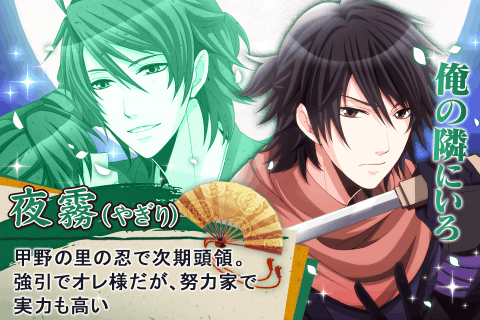 「…色仕掛けか、なかなかやるな」イメケン忍と禁じられた恋に堕ちたとき…待ち受ける運命とは?!忍の宿命と禁断の恋の間で揺れる!毎日5話分ストーリー無料!課金なし(無課金)で読める人気無料のオトナの恋ができる女子向け恋愛ゲーム、恋愛シミュレーションゲームです。◆忍かくれ恋絵巻ストーリー◆里の跡取りであるくノ一の貴女。ある日、町娘に扮して任務を遂行後、町を歩いていると彼に出会い…?!忍の宿命を背負いながらも、誘惑に揺れる秘密の恋の行方は…◆忍かくれ恋絵巻キャラクター紹介◆?夜霧甲野の里の忍で次期頭領強引でオレ様だが、努力家で実力も高い?蒼生伊野の里の忍で兄のような存在忍としての実力は申し分なく、里で人気者?三雲蔵ノ介里と関わりがある村の領主ドSで利己的だが、村のために尽力している◆こんな方にオススメ◆?イケメンに囲まれる戦国、忍、大奥、幕末、王宮のような世界感のラブストーリーゲームが好き?運命の人と運命の恋をしたい?ドS、俺様、クール、天然、セクシーなイケメンとドラマのようなラブストーリーがしたい?イケメンと禁断の恋、運命の恋をしてみたい?幼なじみがイケメンの乙ゲーがしたい?秘密のオフィスラブ(社内恋愛)でドS、俺様な男性から大人の誘惑をされたい?社長、御曹司、セレブ、王子様からプロポーズされて結婚指輪か婚約指輪をもらいたい?人気無料女性向け恋愛ゲームで運命の恋をしたい?普段からダミヘをしてフルボイスの女性向け恋愛ゲームや乙女ゲーム(乙ゲー)を楽しんでいる?トキメキや胸キュンできる刺激的な恋愛ゲームを求めている恋ゲー好き女性?無課金、課金なしでラブストーリーを読みたい?恋愛小説やライトノベル、携帯小説が好き?オフィスラブという禁断の恋に憧れている?年上、年下あらゆるイケメン男性から囲まれて逆ハーレム状態になる女性向け恋愛シミュレーションゲームを探してる?恋愛漫画、少女漫画、恋愛小説、携帯小説等とにかく恋愛系、乙女系の恋愛ドラマアプリを探してる?疑似恋愛でもいいから彼氏、旦那、婚約者を探してる?ドS、俺様、クール、天然、セクシーなイケメンと結婚できる女性向け結婚ゲームを探してる?bl、ボーイズラブでも大人向けの刺激的な恋愛ゲームが大好き?カリスマ男子、セレブ、王子様、プリンス、社長、御曹司と非日常的な恋愛体験をしたい?アラサー女子向けの大人の恋愛ゲームを探してる?幼なじみと秘密の禁断の恋をしたい?女性向け恋愛ストーリーゲームや恋愛シュミレーションゲームが好き?ドS、クーデレ、ツンデレ、俺様、セクシー、天然、クール、ミステリアス等のイケメンに囲まれ胸キュンしたい?ときめくキスができる甘い恋愛ゲームを探してる?乙女系の男性声優の甘いボイスの入った声付き恋愛シュミレーションゲームを探してる?運命の恋や禁断の恋など恋物語が好き?ミッションがなく無課金でも楽しめるゲーム、絵がカッコいい恋愛シミュレーションゲームを探してる?執事や公爵に囲まれてプリンセスやお姫様気分を味わいシンデレラのような恋ができる恋アプリを探してる?人気で無料の読み放題の恋愛小説や恋愛漫画を探してる?恋愛系、乙女系のコミックが好き?声付きの恋愛ラブストーリーゲームや恋愛ゲームを探してる?甘く刺激的なキスの出来る刺激的な恋愛ゲームを探してる?恋愛ストーリーゲームのような感動するロマンチックなプロポーズをされたい?恋愛ドラマ、ラノベ、少女漫画、恋愛漫画、恋愛映画が好き?イケメンに囲まれた逆ハーレムの乙ゲーや乙女ゲームを探してる?胸キュンしたい女の子の為の女子ゲー(女子ゲーム)を探してる?ボーイフレンド、彼氏、婚約者、旦那が欲しい?セレブ社長や御曹司と恋愛ゴシップニュースになって騒がれたい?恋ゲー、乙ゲーでボルテージMAXになる?人気男性声優の声付きフルボイスの乙ゲーを探してる?セクシーで大人向け恋愛ストーリーゲームを探してる?壁ドンや顎クイ等のドキドキシチュエーションに憧れている?王室や宮廷等の世界感の大人向け恋愛ゲームが好き?年下のイケメン美少年が出てくる学園ものの恋ゲーを探してる?関西弁のクール美形男子に告白されたい?結婚する前は、同居、同棲、婚約したい?絵がカッコいい恋愛シミュレーションゲームを探してる?刺激的なデート気分を味わえる大人の恋愛ゲームを探してる?乙女ゲームでドラマチックな恋愛ストーリーを体験したい?とにかく無課金でも楽しめるゲームを探している?課金なしで女子向けの恋アプリや女子ゲーを遊んでドキドキしたい?オフィスラブでキス?!二人だけの秘密のシチュエーションを求めている?カリスマ性があるイケメン彼氏、ボーイフレンド、旦那が欲しい?恋愛ノベルゲームや恋愛コミックがとにかく好きでたまらない?恋愛アニメ等に出てくる男性人気声優の甘いボイスに胸キュンする?読み放題の恋愛漫画や恋愛コミックを探してる?ドSだけど優しい、セクシーだけど天然のようなギャップのあるイケメンに恋する大人向け恋