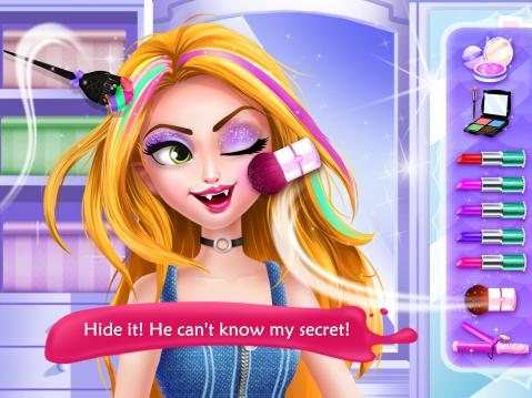 貝拉決定隱瞞自己變成吸血鬼的秘密,繼續回到學校上學。班上新來了一位轉校生,紮克,他帥氣又風趣,和貝拉總有聊不完的話題。很快,貝拉和紮克變得很親密。但是,奇怪的事情卻一件一件的發生,在這個看似普通的高中裡,卻隱藏著許多的秘密……”在這個遊戲裡,你將扮演最酷的吸血鬼少女。你將演繹屬於自己的校园愛情故事。你將去探索與發現這個表面平靜、看似普通的高中裡隱藏著的各種秘密。你,就是貝拉。-紮克終於約你出來了!今晚將是你們的第一次約會!-快快,藏起你的吸血鬼面容,成為他最可愛的高中女生吧!-從頭到腳的美容大改造,從一個愜意的SPA開始。-數不盡的潮流美妝單品。-穿上最閃亮的裙子去約會!-DIY髮型,還可以做挑染哦!DIY眼影和唇膏設計。-噢,紮克也正為第一次約會而感到緊張呢,快去幫他做準備!-終於在嚮往已久的餐廳,與紮克共進晚餐。收到了浪漫的玫瑰,點亮了香氛蠟燭,享用了美味的甜點……一切看起來都那麼浪漫美好!-天呐!大事不好!不小心暴露了自己的吸血鬼身份!怎麼辦怎麼辦?-我會把他嚇走嗎?紮克知道了我的秘密之後將作何反應?更多的隱秘故事和神秘人物,將在隱秘高校陆续登場!