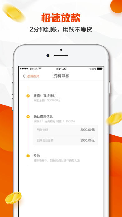 3、极速放款:2分钟到账,用钱无需等待