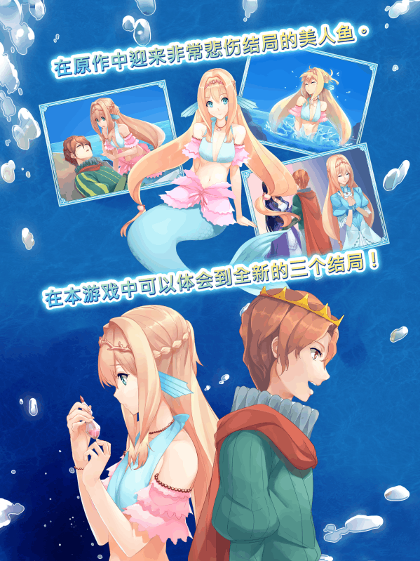 ◆◇游戏内容◇◆对安徒生名著悲剧爱情故事“美人鱼大胆改编!!你的选择和指尖会带来新的故事!!轻松·简单`手机游戏!!和格林童话”齐名的安徒生童话中名作《美人鱼》在大海的深处、海底住着的美人鱼在15岁之前她们是不能离开大海的。六个姐妹中最小的美人鱼,对皇太后和姐姐讲述的地上的故事兴致勃勃。被地上的生活和人类强烈吸引。终于长到15岁了,来到地面上的美人鱼得以和缘分中的王子相遇了…在原作中迎来非常悲伤结局的美人鱼。在本游戏中可以体会到全新的三个结局!◆◇推荐给这样的用户◇◆?喜欢神话的人?喜欢童话传说的人?喜欢玩游戏,但是挤不出时间的人?想要简单便捷地玩游戏的人?喜欢日本游戏的人◆◇有以下语言版本◇◆?日语?英语?繁体字?简体字?韩语