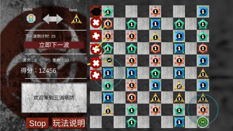 把系统随机生成的Next位置的塔放入10X10的格子里如果暂时不需要,可以点击中间的箭头存储在Store位置三个及以上相同等级的塔会生成更高级的塔,生成所用的塔的数量越多,攻击力越高长按某一个塔,就可以查看该塔的详细数据敌人会从左上角的位置出发到右下角的位置终止根据你放置塔的位置,敌人会找到最短路线每一个敌人到达终点,就会损失一点生命这里也可以看到当前的波次和得分一共有六种塔激光塔,会发出一道激光,碰到的敌人都会受到伤害减速塔,在它的范围内,敌人的速度会减小炮塔,炮弹打到敌人后,还会爆炸,伤害周围的敌人机枪塔,发射的子弹很快百搭塔,可以和任何塔一起搭配生成更高级的塔炸弹塔,可以炸掉不需要的塔和想杀死的敌人除了百搭和炸弹,其他的塔一共有6级敌人分四种小兵急速兵,速度快分裂兵,死后会分裂出两个小兵大BOSS,血真的很厚游戏有排行榜,看看自己能得多少分数
