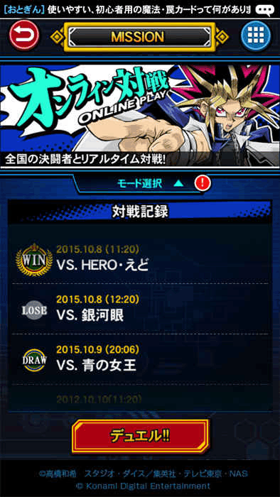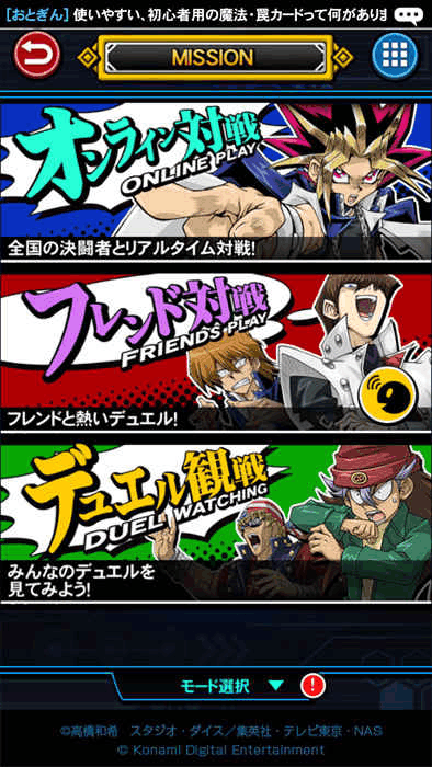 新作《游戏王:决斗场》是《游戏王》系列手游作品,将实体的集换式卡牌《游戏王OfficialCardGame》针对手机做出最佳优化,主打卡片对战体验。初学者将可以透过教学模式轻鬆的开始游戏并学习进阶技巧,并透过线上对战随时随地与朋友或是全世界的玩家对局。单人体验的模式中,玩家可以看游戏内登场的一般或是著名决斗者对战,获得胜利后可以得到新卡片强化牌组,提升角色等级学习新技能等,来育成强化自己的实力。另外,通过任务后会现身新的传说级决斗者参战,以及解放新模式。线上对战中,可和全世界的玩家进行即时对战。对战将会自动和等级相近的玩家配对,或是选择登录为好友的玩家对局。也可以和过去已对战的玩家牌组进行模拟练习对战。