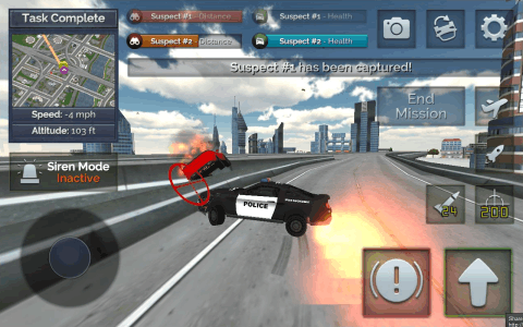 Wanttogofastonthecitystreets,breakthesoundbarrier,orevenfirehomingmissiles?Getreadyforanactionpackedexperience.Tryoutthelatestflyingpolicevehiclesinthispolicecargame!Crimeisatanalltimehighinthecityanditisbecomingoutofcontrol.Policehavedevelopednewpolicevehiclestocombattherobbersandkeepthecitysafefromcrime.Transformyourpatrolvehiclefromregularstatepolicecarintoaflyingpolicecarwiththeflickofaswitch.Becarefulnottolosetrackofyourtargetorgettoofarawayfromthem,they'llgetawaywithcommutingthecrime.Itisyourjobtostopthematallcosts,chasethemdownintheairbeforethegetoutofthecity!Easytoflyanddrivewithquicktransforming,youcangetaroundthehugeopenenvironmentasquicklyaspossibletoapprehendthecriminal.Watchoutforotherflyingcars!Takedownrobbersandcriminalswithanymethodofyourchoice;crashintothem,boost,fireheatseekingmissiles,gunthemdownwithmachinesguns,andmore!