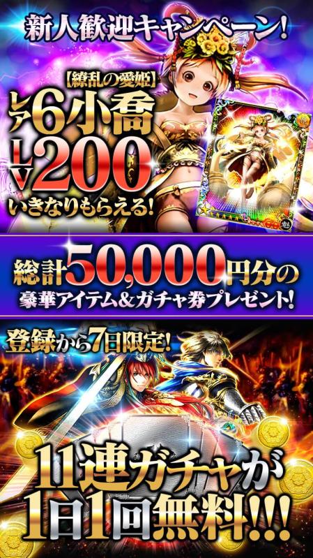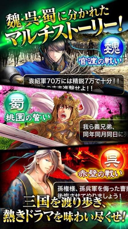 ☆トップ無料1位獲得!☆AppStoreランキング1位を獲得した超大人気?三国志の育成カードバトル!160万ダウンロードの育成カードゲーム「関ヶ原演義」70万ダウンロードの「疾風幕末演義」の続編。大人気を誇る「演義シリーズ」アプリ第3弾です。中原の覇者となって、三国志の世界で天下統一の野望を抱け!舞台は中国へ???その世界は∞(インフィニティ)三国乱世に咲く華となれ!大人気育成カードゲームアプリ「関ヶ原演義」「疾風幕末演義」の続編。三國が舞台の「演義シリーズ」第3弾です。■三国志がモチーフのカードバトル「繚乱三国演義(りょうらんさんごくえんぎ)」とは?魏?呉?蜀の三国が争覇した、群雄割拠の三国時代の歴史である、世界中で人気の三国志(さんごくし)をモチーフとしたとした本格的ソーシャル育成カードゲームこれまでの演義シリーズ同様に新説の三国志演義をモデルにしたボリュームのあるストーリーを楽しみながら、古今無双(ここんむそう)の三国武将を育てて、三国制覇の夢を抱き(いだき)、三国統一を目指しましょう!■いつでも手軽に!難しい操作は一切不要。いつでも誰でも手軽に遊べ、空いた時間で少しずつでも楽しめます。もちろんDL無料。■魅力的なストーリー!三国時代の猛将、智将、軍師、美女、美少女など英雄達が魏、呉、蜀の勢力に分かれて覇権を争い、蒼く染まる天地を乱舞した中世の中国が舞台。あなたは、戦乱の世に生まれながらも、戦いとは無縁な生活をしていた1人の若者。ひょんな出会いから戦いの舞台へと身を投じ、自分の勢力を勝利に導く為、武将として青い空、広大な大地が広がる三国志の世界へ旅立つ???。戦国時代統一の夢を抱く(いだく)!武将を育成して、自分だけの軍勢を率いて王国(キングダム)を作る!その可能性は∞(インフィニティ)!conquestofglory(コンクエスト オブ グローリー) 栄光を獲得しよう!■三国志「物語」を進めて有名武将を仲間に!史実に基づいた三国志(さんごくし)の世界を曹操、孫権、劉備と共に駆け巡り、出会う有名武将たちをどんどん仲間にしていき、育てて攻略しよう。■魅力的な古今無双(ここんむそう)の「武将」たちが勢揃い!三国志の世界を演舞するレジェンドのイケメン?美少女、武将達が勢揃い!曹操の率いる魏軍には、張遼、楽進、曹仁が、孫堅、孫策、孫権の親子が率いる呉軍には、周瑜、陸遜、魯粛などが登場。「三国志」周瑜伝で「蛟竜、雲雨を得れば終に池中の物に非ざらん」と蛟竜に例えられた劉備。※いままで活躍の場に恵まれなかった英雄や豪傑が機会を得てもてる能力を発揮することを意味している。その劉備、関羽、張飛の義兄弟が率いる蜀軍には、黄忠、馬超、諸葛亮、などなど、■武将を「進化」させて三国最強の部隊を作り育て攻略しよう!同じ武将同士を獲得したり、強化アイテムを使って「強化」することで武将のレベルを上げ、一定のレベルに育つと、カードの画像も豪華になり、特技の能力がパワーアップ!■「同盟」を結成して対抗する勢力を殲滅せよ!仲間を集めて育成(いくせい)し、「同盟」を結成、。「三国大戦」に参加して栄光をつかめ!同盟での役職スキルや戦略を駆使して、自軍の勢力を勝利に導くと、豪華なアイテムが手に入る!【育成カードゲーム「繚乱三国演義(りょうらんさんごくえんぎ)」はこんな人にオススメ】?携帯(けいたい)スマートフォンで無料でも楽しめるカードゲームを探している人?三国志(三國志)に興味を抱く(いだく)人?女性でも楽しめる、かーどげーむを探している人?トレーディングカードゲームをコレクションしている人?ソーシャルゲームで楽しんでいる人?育成?育てるゲームが好きな人?イケメン?美少女?美女などが登場するカードゲームが好きな人?カードRPGが好きな人ユーザーの皆様へこちらのゲームは繚乱三国演義です。繚乱戰國演戯、三國円舞、三国炎舞(演武)、繚乱真選演技、などお間違えがないよう注意して下さい。※きちんとした審査を行っているため、アダルト、ポルノ、エロ、ウィルス等、有害コンテンツの心配をすることなくお楽しみいただけます。三国志カードバトル、繚乱三国演義が人気の「演義シリーズ」とは?第1弾は、DL無料の人気戦国育成(いくせい)オンラインカードバトルゲームRPG「関ヶ原演義(関原演義)(せきがはらえんぎ)」徳川家康、豊臣秀吉、織田信長、明智光秀も登場する、関ヶ原の戦いをモチーフにしたカードバトルRPG。第2弾は、坂本龍馬、沖田総司、篤姫、斉藤一、土方歳三、近藤勇、新撰組(新選組?しんせんぐみ)など幕末の有名志士たちが、美麗カードで登場する歴女にもお薦めの育成カードゲーム「疾風幕末演義(しっぷうばくまつえんぎ)」そして、第3弾が三国志(さんごくし)がテーマの育成(いくせい)カードバトル「繚乱三国演義」です。新規機能の追加準備引き続き繚乱三国演義をお楽しみください!