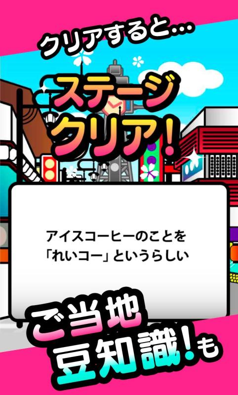 ★完全無料★脱出ゲームのようで脱出ゲームじゃない!?旅行気分でできる、ちょっとシュールな謎解きゲームの登場です。香川といったらうどん!大阪はたこやき!熊本は熊本城!ご当地のものが謎解きのカギを握っています。方言や歴史の勉強にもなるかも!?クイズあり!パズルあり!計算あり!簡単なのでちょっとした空き時間にできますよ。難しいと思ったらヒントがみられるので安心??謎解きがしたい!?面倒な計算はしたくない!?ホラーは苦手!?ヒマつぶしがしたい!?トークやチャット、飲み会などの話題のネタに!という人におすすめ!ギャグマンガ風でサクサク遊べます?クリアすると各都道府県の豆知識や雑学がみられるので話題づくりにも?世界遺産や人気の観光地の謎を解いて、西日本を制覇しましょう!?遊び方?まずはとにかく怪しいところをタップ。隠れたアイテムが見つかるかも!スマホを振ったり傾けたりして進むステージもあります。直感的なひらめきが必要な場合も。ステージには必ずヒントが隠されています。くまなくタップしてみましょう。?ランキング?全ステージクリアまでの時間で全国ランキングに挑戦!目指せ、全国一位!※ヒント機能を使用した際に表示される動画の視聴時間はクリアタイムに影響されません。対応OS:Android4.0.3以上※通信環境が不安定な場所ではヒント機能やランキング機能が正常に動作しない恐れがあります。※データ等の復旧は対応しておりません。データ?アプリの管理は自己責任でお願いします。軽度のバグ修正