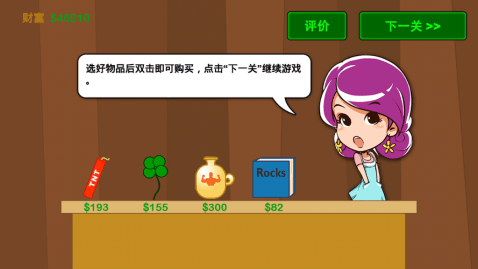 使用采集器来采集地下金矿,采集器的爪子会来回摆动,点击屏幕爪子会放下,碰到东西后会自动抓起并回收。如果采集到重物例如岩石或者大块的金子,采集器的抓回速度会变慢。游戏中的随机包裹里可能包含金子,炸弹或大力道具。关卡之间会进入商店你可以在那里购买道具来帮助你更顺利的完成关卡。