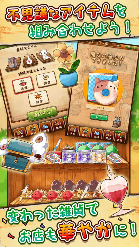 不思議な雑貨を作ってお金を稼ぎ、店を立て直そう!■ストーリー「大魔女が死んだ」両親からの頼みで魔女の雑貨店を引き継ぐことになりました。はじめての街、知らない人々。人々は活気にあふれていましたが、魔女がいなくなったことを不安に思う声もありました。店の中に入ると既に店内は荒れ放題。帰ろうと思い扉へ向かうと、男の子がお店の中を覗いているのが見えました。「お姉ちゃんが新しい魔女?魔女のクッキー売ってる?」子供のころにあこがれた魔女。今こそ、夢を叶えるときが来たのかもしれません。■遊び方森や湖で素材を収穫し、レシピを元に組み合わせて様々な雑貨アイテムを作りましょう。商店街では、足りない素材やレシピを買い足したり、設備を拡張して、お店や収穫の機能を強化することができます。街の人の声によって、売れる商品が変化することも?流行を掴んで、人々に愛される魔女の雑貨屋を目指しましょう!■こんな人にオススメ?可愛いアイテムが好きな人?空き時間に手軽に遊びたい人?こつこつ進めるのが好きな人?魔女になりたい人バグを修正しました。