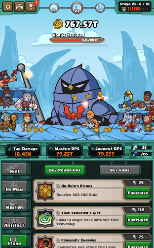 太空超人:决战骷髅王(He-Man?TappersofGrayskull?)是一款以点击为战斗玩法的角色扮演游戏,玩家将会在游戏中扮演传奇英雄太空超人,大战邪恶的骷髅王和他的喽啰们。玩家将与太空超人一起展开惊险刺激的冒险,战胜邪恶的骷髅王。太空超人并非孤军作战,玩家可从宇宙各地召唤同伴来共同作战。游戏的玩法还是常规的点杀怪物,升级人物的属性以及同伴英雄的属性,不同的是在打BOSS的时候会提示弱点,按照指示点击弱点可对BOSS造成大量的伤害,加快击杀速度。即爽快又能宣泄不爽的心情,相当适合放松解压。