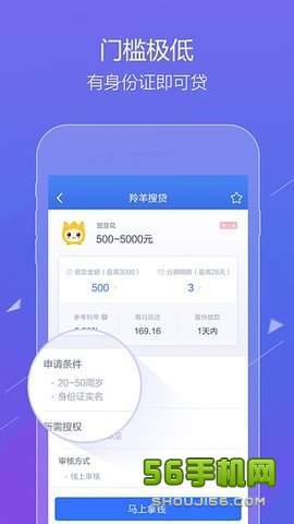1、门槛低:手机申请,凭身份证可借款,无需担保,无需签约;