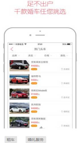 婚车找找软件特色: 1.专注于婚礼租车平台,提供性价比高的婚车。 2.三种模式任你选择,满足多数新人对车子的要求。 3.用法简单,在家里连上wifi就能够轻松选择自己喜欢的车子。