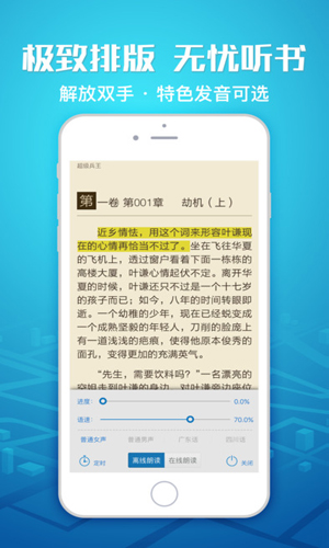 【免费畅读小说功能特色】 1、专业编辑精挑细选百万本图书资源,最新最热最全网路小说一网打尽; 2、流畅舒适的阅读体验:採用最新的排版引擎,3D仿真翻页特效。支持自动阅读,语音朗读; 3、TXT长篇小说高效率智能辨识生成章节目录; 4、像操作桌面图示那样快速完成书籍分组,书籍管理轻鬆简单; 5、触屏滑动顺畅、展开书籍快速、阅读翻页无缝,性能稳定速度超群; 6、自动记录最后阅读的位置,另设书籍更新实时温馨提示,服务贴心; 7、随时参与读者讨论、献花打赏支持所读小说,多种互动方式随心使用; 8、无网路多格式文本离线阅读,支持TXT、EPUB、UMD等30多种文本格式阅读。 ——————————————————————————————————————— 手机必备的中文阅读软体,全网海量小说任你搜,无广告无插件绿色体验。专注网路小说阅读,资源全,小说多,更新快!