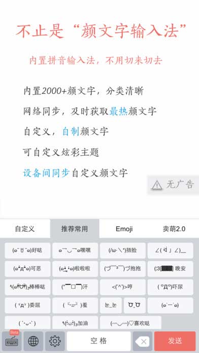 颜文字输入法app最新功能: 真正的颜文字输入法,直接在任意地方调用输入。 不止是颜文字输入法,内置全功能的拼音输入法,卸载掉你手机里的百度搜狗吧,再也不用切来切去! 输入法中加入所有的表情,表情达到2000+,是目前表情最丰富的颜文字app。