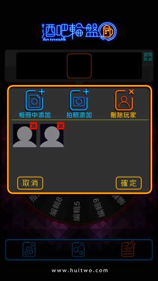 酒吧轮盘1.1特色: 1、可自定义编辑转盘信息。 2、可自传照片定义头像。 3、可删除添加玩家。