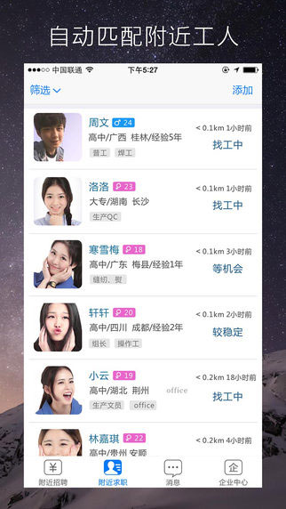 近多多招聘怎么样 1、打开软件,你可以根据附近的选项来查看附近的企业招聘信息。 2、软件中有很多你可以自定义筛选的条件,你可以根据这些条件来进行筛选工作。 3、同时你还能在这里找到附近的人,让他们帮你一起介绍工作。 4、这里没有任何的中介公司,你可以放心的在这里找工作。