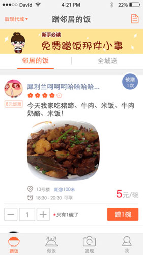 街边的饭馆吃腻了?想要尝点家常菜但是不会做?蹭饭IOS版为那些没有时间做饭的人提供邻居做的饭菜,同时也可以让做饭的邻居获得一些外快,经济实惠!