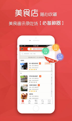 美食通讯录IOS版功能 1.收藏海量美食店,分享到自己的通讯录 2.支持将喜欢的美食店分享到自己的朋友圈 3.提供定位功能,搜索你附近的好吃美食店