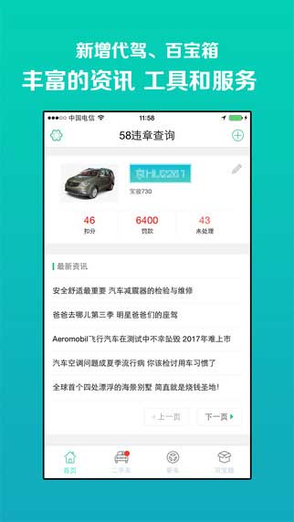 2015年车辆违章查询最智能: 1、新违章、限号主动提醒; 2、多车查询管理及异地查询; 3、北京、深圳违章缴费,更多城市陆续上线中。 4、每日天气及洗车指数; 6、查看周边加油站、停车场; 7、百宝箱:代驾、贴条高发地等更多温馨功能 8、丰富的车主资讯服务