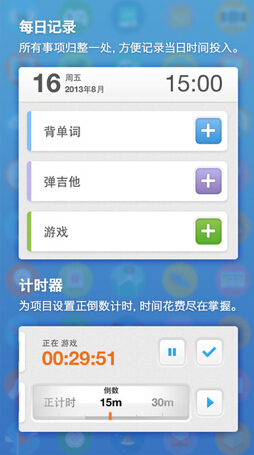这是一个非常实用的帮助你规划,记录时间的app.通过设定好的正数倒计时器,设定每日时间安排。逐渐完成目标。特别设计的时间规划。帮助每一个使用者磨练自己。