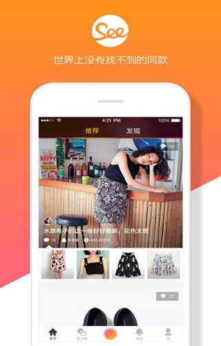 see是一个发现全球时尚同款的移动社区,主要功能是一键拍照找同款。无论你在哪里什么时间,把你想要的而未拥有的商品分享到see,就会有时尚专家和热心用户帮你找到,并提供购物经验。