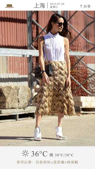 苏格天气衣报时一款天气穿衣的应用软件,主要是针对都市女性日常穿着问题特别推出的一款应用,在关注天气冷暖的基础上,为你提供时尚又实用的着装建议!