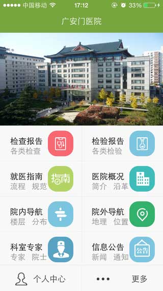 广安门医院是一款公益性医疗健康应用软件,包含了检查,检查报告查询,院内外导航,科室专家信息查询等功能,给病患创造人性化的医疗服务环境!