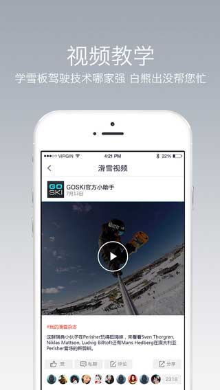 去滑雪是一个滑雪需求的多功能社区服务软件,提供了一站式的服务,全世界滑雪爱好者都在这晒图交友乐园,还有丰富的雪具介绍实用的滑雪视频教程一网打尽!