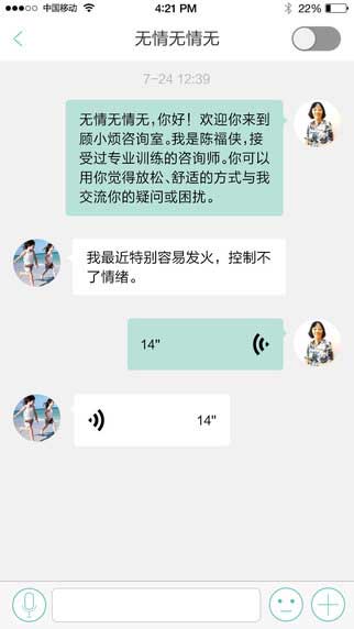 顾小烦咨询师是一个在线心理咨询的应用软件,可通过语音形式进行咨询提供更多来访者资源同时也帮你利用了碎片化时间,让你的生活变得更加充实,还可调整工作时间!