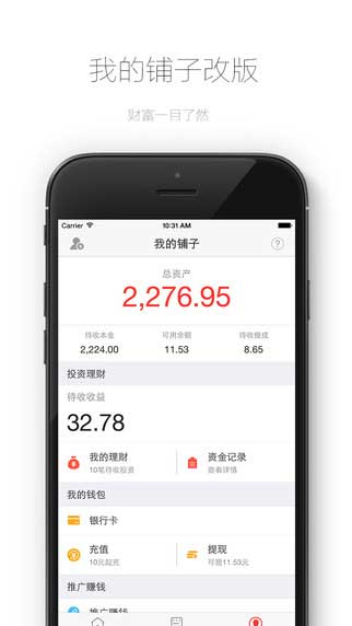 银子铺2.0.2特点: 1、界面全新调整,更加好看更加好用。 2、我的铺子改版,财富一目了然,列表清晰,再投结束一目了然。 3、新增了红包功能,专属的理财服务,实现客户收益的最大化。