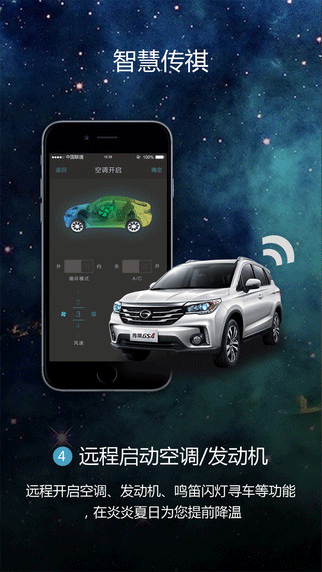 智慧传祺是基于“互联网+”概念开发的业界领先的智能车载服务系统。车主可以通过智能手机、网站和呼叫中心实时享受对车辆的远程控制。