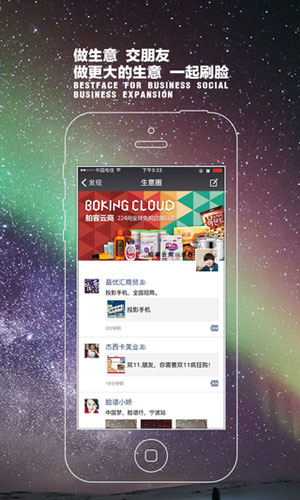 刷脸app应用特色: 1.【做生意用刷脸】便捷的“+互联网工具”,免费搭建手机。 2.【当老板用刷脸】三级分销运营管理系统,经营动态一手掌握。 3.【找客户用刷脸】高智能电子名片高效传播,把产品卖到客户手机里。 4.【买商品用刷脸】线下体验,线上购买;24小时的口袋商城;下载就送18点颜值(1点颜值=1元钱)。