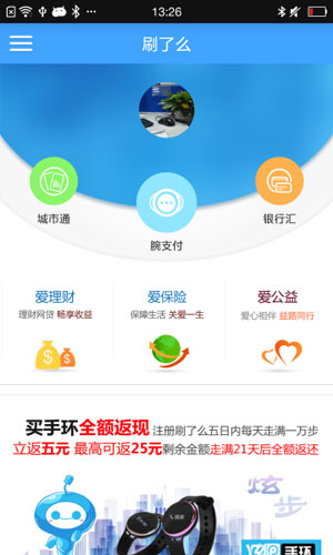 刷了么app应用特色: 1.是一款全景化支付工具,陆续集合智能手环、银行卡、公交卡等多卡合一。 2.是款集合在线查询、空中充值、空中发卡等多项功能于一体的智能产品。 3.打开手机,就能开启智能硬件+互联网金融的移动支付新入口。