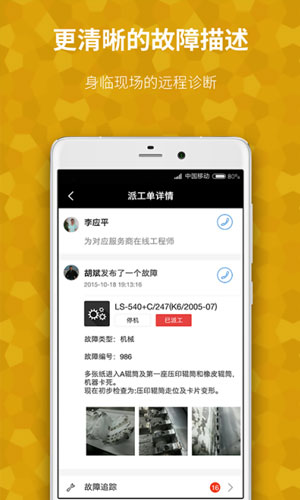 印刷君app应用特色: 1.紧急维修:一键报修、3秒响应,24小时工程师在线诊断。 2.故障追踪:派工换件的每个步骤,所有环节均可追溯。 3.智能派工:匹配的工程师派给你,流程进度看得见。