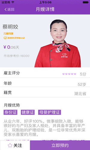 家家月嫂,宝爸宝妈必备的手机app,家家月嫂平台所有月嫂都经受平台系统职业培训,通过职业等级鉴定,下载家家月嫂足不出户,就能在手机上全方位了解月嫂相关信息、挑选心仪的那一位,完成预约、下单。