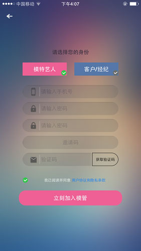 超级模管IOS版帮助模特与经纪人互通需求,这里是一个服务双方的平台,能够帮助模特找到通告,而经纪人也能够找到合适的模特,所用用户均为实名认证用户,提供在线支付与用户中心管理功能!