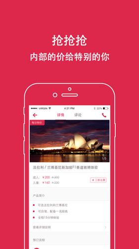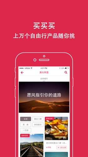 出国去旅行app功能 1.分享全球各地旅行软件主题旅游地 2.提供当地旅游城市特色服务以及演出 3.提供旅行WIFi功能,最低1元起售 4.分享全球美食杂志,让你的嘴巴过瘾