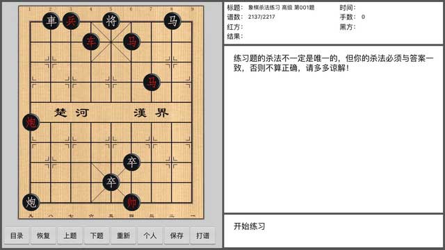 象棋杀法练习1.0特色: 1、包含了各类2217道联系题,分为初级,中级和高级。 2、初级为一步杀的1600道题,中级536道题,高级81道题。 3、如果坚持把这些题目做完,杀棋能力将会明显提高,甚至更高。