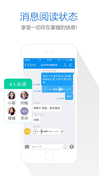 钉钉,新一代的团队沟通方式!顺应移动互联网团队沟通:颠覆传统的IM,为团队沟通而生,更高效更安全;让你的消息和你一样重要:感知消息发送者的诉求,不同重要程度消息分层传达,保障重要消息必达; 互联网和电话通讯融合:移动互联和传统电话通讯的全新结合,信息触达更高效;钉钉为中小企业而生,提升其内外沟通协同中的效率,所有服务全部免费。