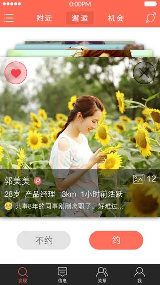 天际好好约主要功能: 1)基于用户地理位置的社交, 身边:发现你身边有趣的话题,有价值的人; 邂逅:让你的职业社交更加有趣味; 机会:让你的职业发展更加有选择; 2)个人档案,更丰富,更全面。给用户一目了然、一步到位的职业形象展现; 3)心情签到:这是专门为女性用户研发的有趣功能,是你分享好心情、宣泄坏情绪的便捷入口,同时可以得到真切、有诚意的反馈与认同。